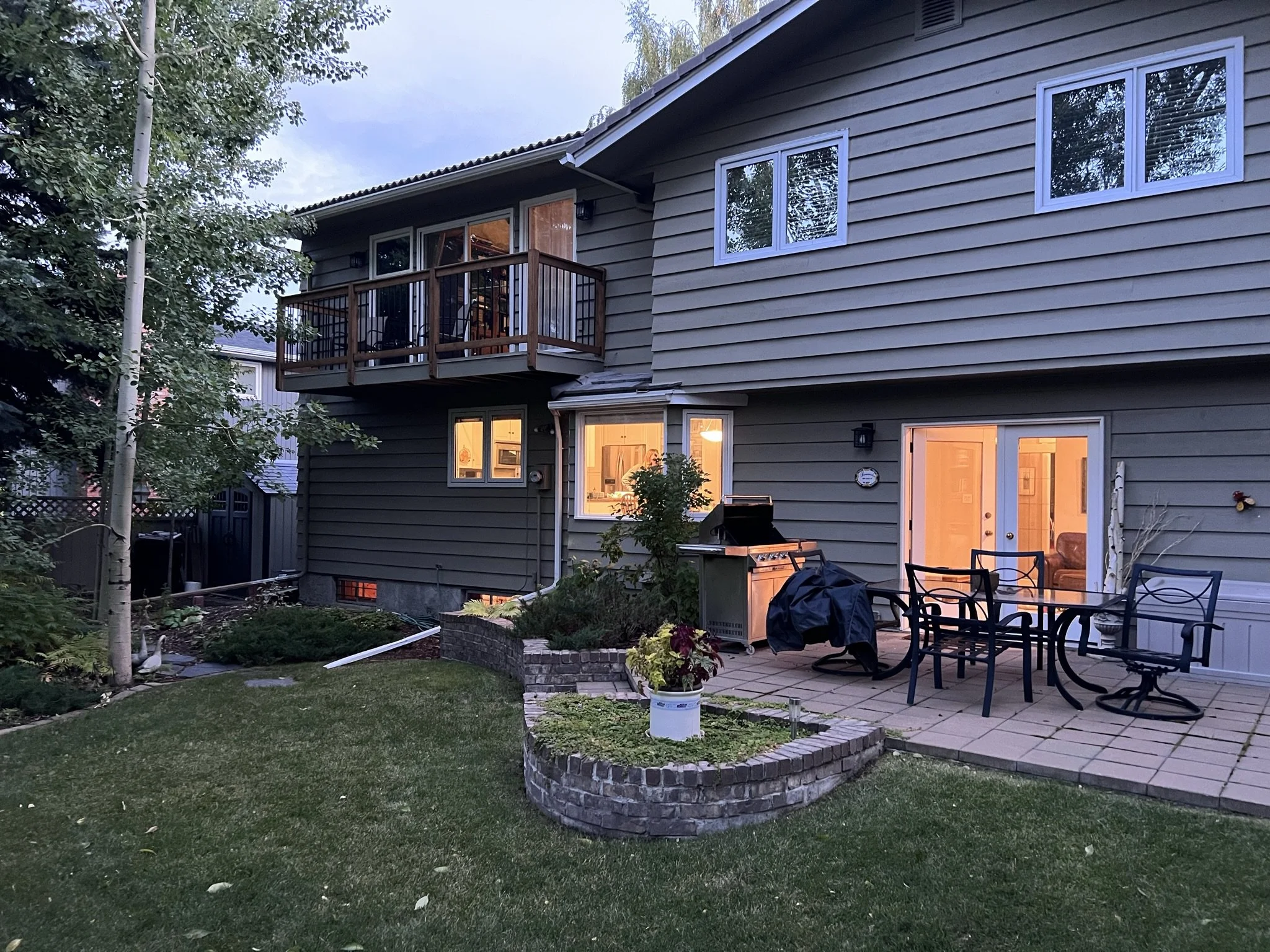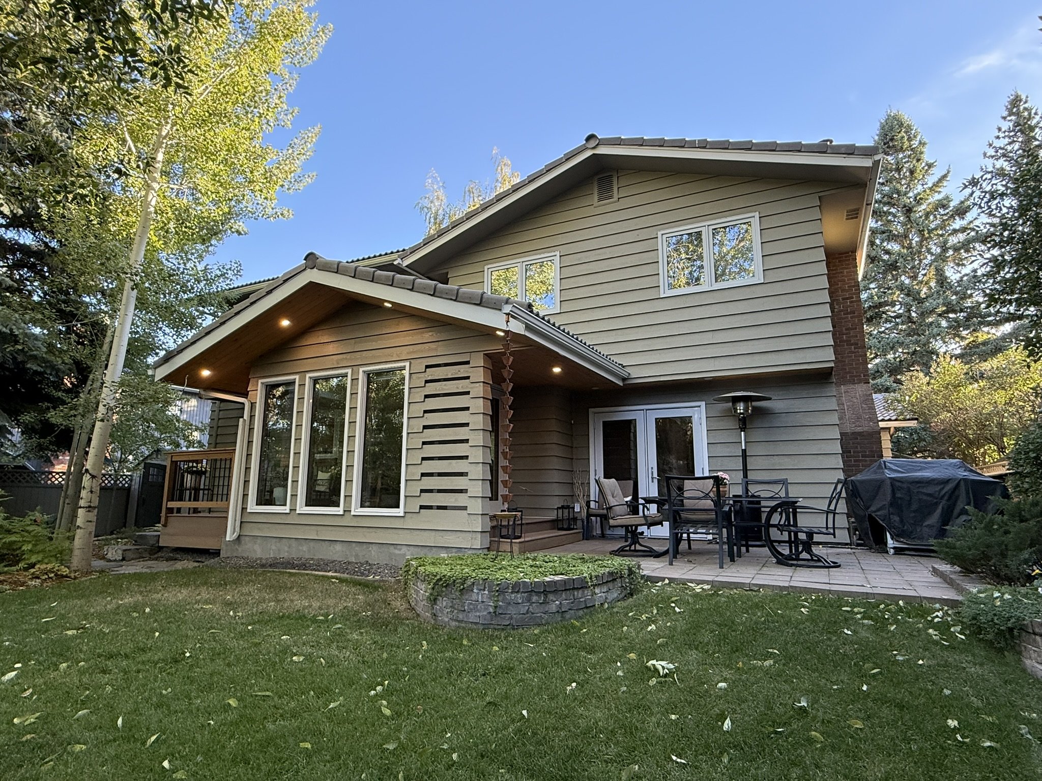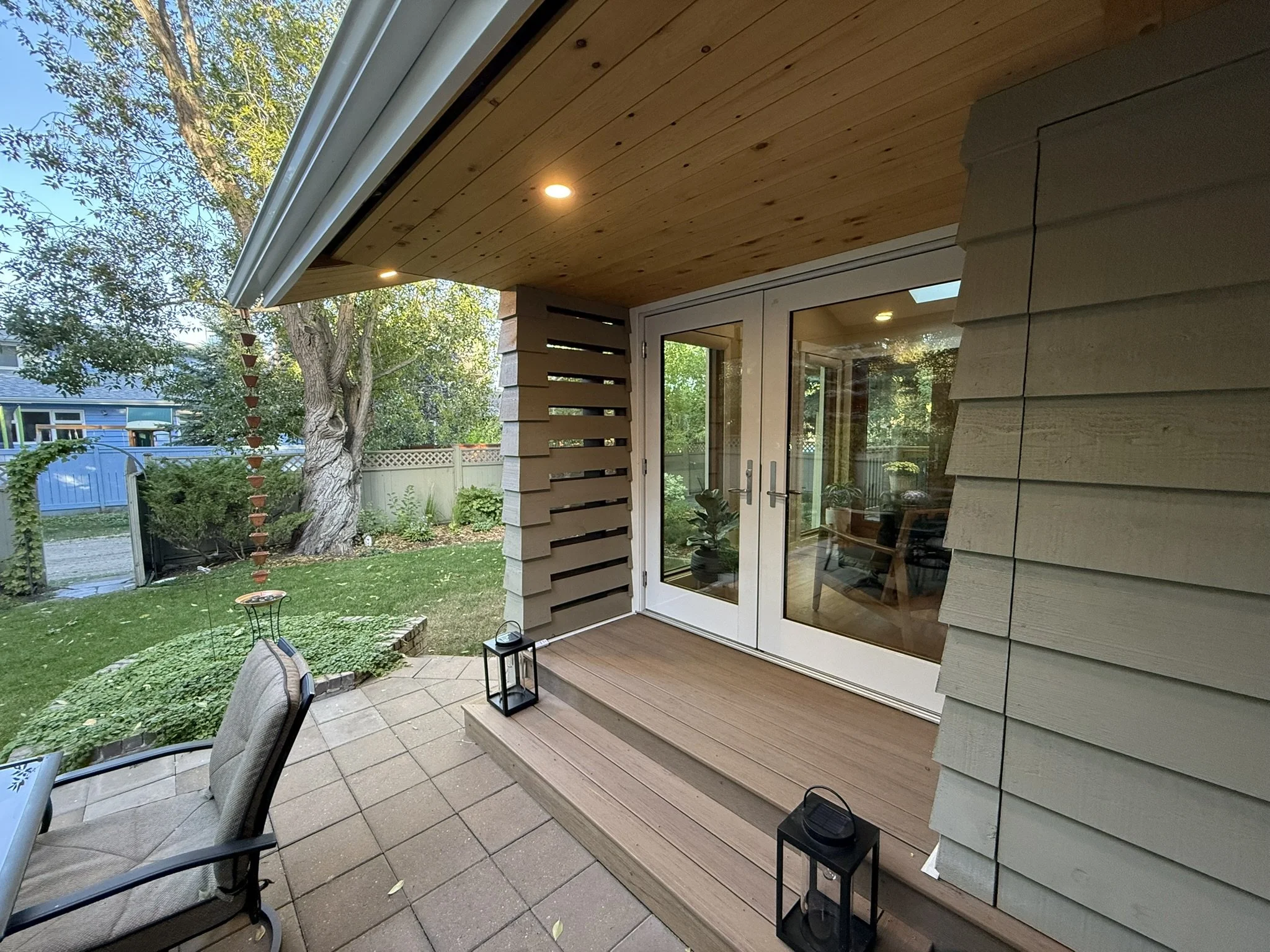 The project adeptly integrates with the landscaping, incorporating new as well as old features. The new side deck quietly touches the existing aspen grove, while an existing brick planter was relocated to make way for new steps from the patio and capture runoff from the addition through a rain chain.